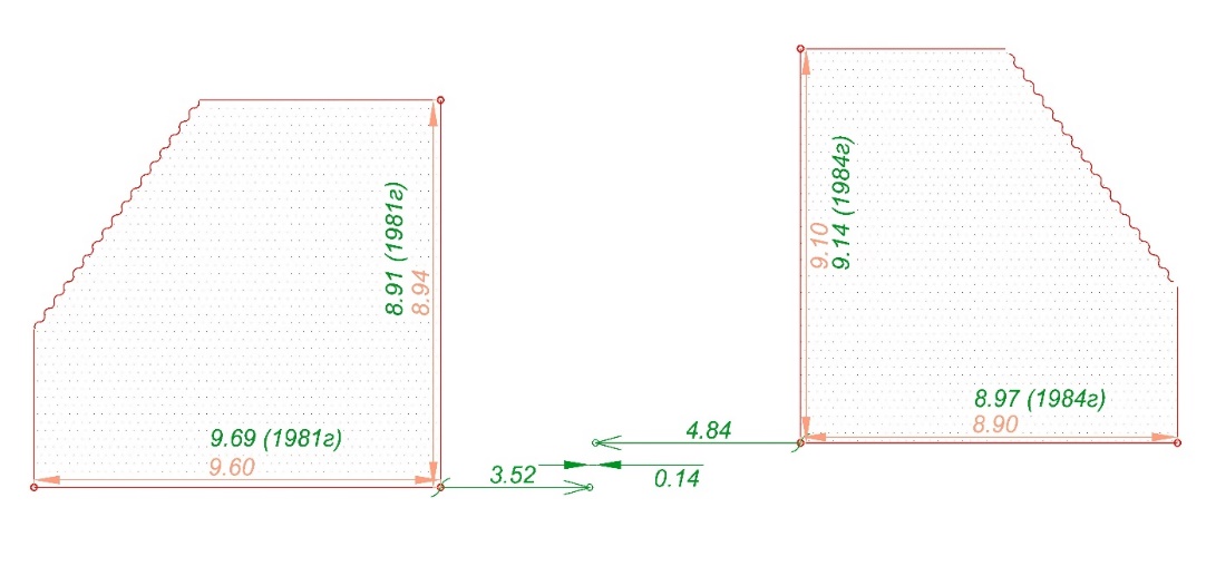 Не всякие однородные сравнения возможны. Не проводится однородное сравнение, например, в отношении спорной части границы земельных участков, определённой по результатам натурного обследования, если эти границы распознаны однозначно и одинаково – у эксперта и сторон сформировалось единое мнение относительно положения границы на местности. На практике многие эксперты игнорируют однородные сравнения и не проводят их. Между тем однородные сравнения могут иметь важное значение для последующей оценки доказательств. Например, в абрисах материалов технической инвентаризации, выполненных более 15 лет назад в разное время, указаны расстояния 3,52 м и 4,84 м от стен зданий до забора, расположенного по смежной границе, являющейся объектом спора в настоящее время. В случае установления тождества зданий, существующих на момент проведения экспертного обследования, со зданиями, отображёнными в материалах технической инвентаризации, необходимо в исследовательской модели отложить отрезки с обозначенными в абрисах длинами от контуров стен, определённых при натурном обследовании, и сравнить положение их окончаний методом компьютерно-графического сравнения, как показано на рисунке 1. Результаты такого сравнения позволяют дать оценку качеству (достоверности) данных в исследуемых документах.